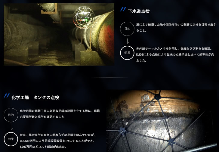 そんな背景の中、同社では昨年にスイスに本社を置く「Flyability」社と業務提携。屋内狭小空間の飛行に最適な性能を持ったFlyability社の「ELIOS」を採用。これまでに屋内点検分野での新たなソリューションサービスを展開した。