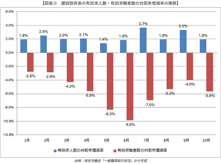 建設技術者の有効求人数と有効求職者数の対前年増減率の推移を見ると、直近の10月では有効求人数は1.9%増加しているものの、有効求職者数は5.6%減少するなど、全ての月で有効求人数は前年を上回り、有効求職者数は前年を下回っている。(図表②)