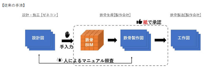 従来の鉄骨工事において、構造設計のデジタルデータがあるにも関わらず、多くの鉄骨製作会社では、構造設計図書から構造情報を読み取り、鉄骨BIMソフトを用いて通り芯から部材の登録や配置、仕口や継手などの詳細化までを手作業で行って鉄骨製作図を作成していたそうです。