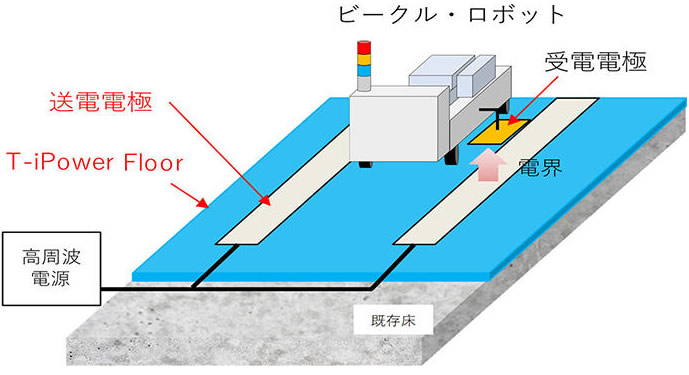 高周波電源を送電電極に接続することで、走行中のビークルなどへ電力をワイヤレスで送ることが可能となる。この給電床を実装することで、ビークルなどバッテリー充電や交換作業が不要になり、稼働率が大幅向上する。