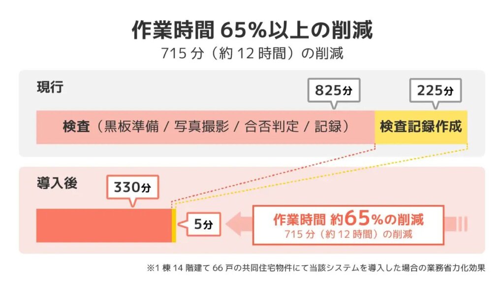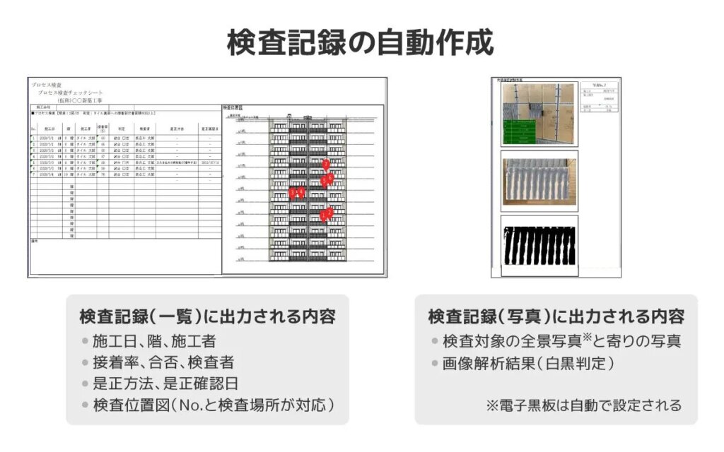 また、従来バージョンと同様※1に、建設現場で正確かつ客観的な検査および記録が即時に行え、事務所で検査記録が自動で作成できます(特許出願中)。これにより、外壁タイル施工における検査業務全体の約65%(約12時間)の削減を実現します。