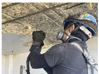 現在の断面修復作業は、劣化したコンクリートを削り取る「斫り(はつり)」作業を筆頭に、騒音や振動、粉塵、そして修復材の重量物運搬を伴います。
