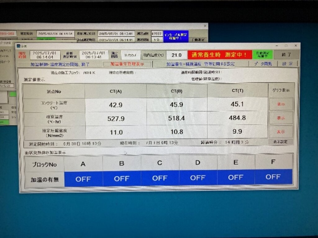 そして、コンクリート内部の温度をリアルタイムで監視するIoT技術を活用した正確な温度管理(マチュリティ法)による型枠解体時期の最適化です。