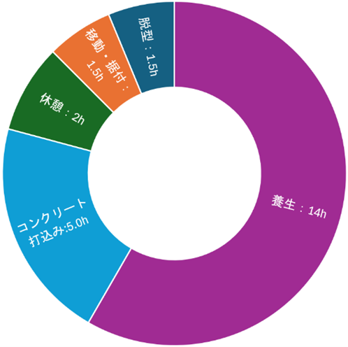 今回の施工では、セントルの脱型、移動、据付が約3時間、休憩が約2時間、コンクリートの打設作業が約5時間、翌日の脱型までのコンクリートの養生が約14時間で、合計1日(24時間)で実施しました。