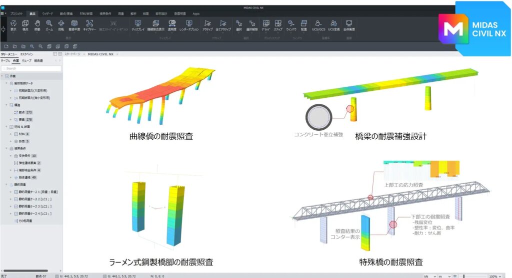 土木構造分野の3次元構造解析・耐震設計プログラム MIDAS CIVIL NX を活用して、一連の耐震設計・補強検討フローを体験します。