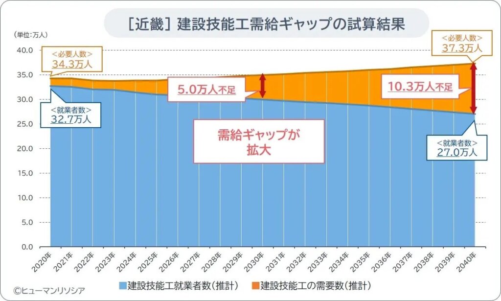 試算の結果、近畿エリアでは、技能工の不足が拡大し、2030年には5.0万人の不足、2040年には10.3万人が不足すると試算されました。
