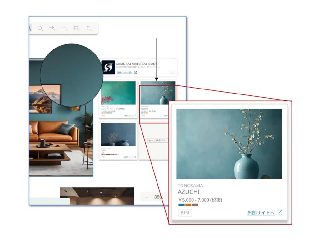 AIが空間写真を解析し、各メーカーの建材データベースと照合。見た目だけでなく、価格・性能・在庫情報に基づく素材提案を実現します。将来的には積算・見積・BIMデータとの連携も視野に、設計からコストマネジメントまでを一貫して支援します。