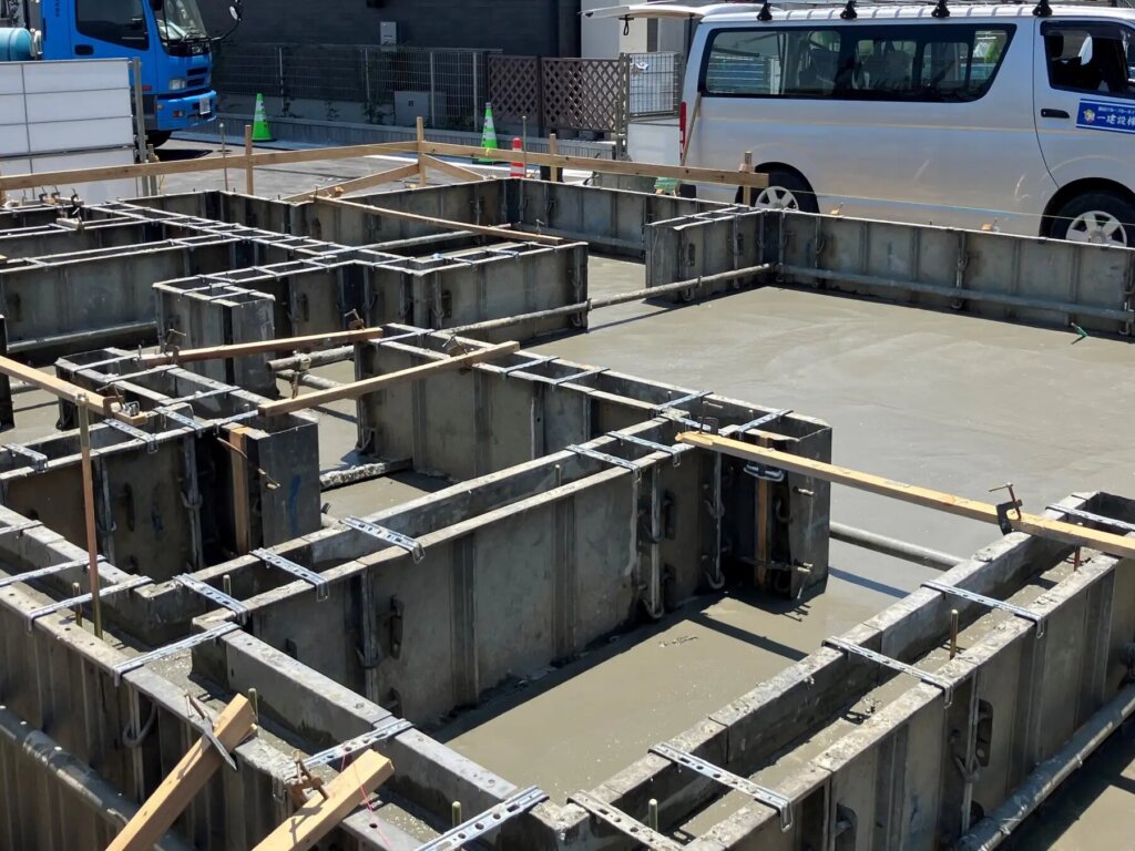 住宅の基礎工事において一般的な、ベタ基礎の底盤と立ち上がり部を1回の打設で一体化する「ベタ基礎コンクリート一体打ち工法」は、少数棟現場において合理的な施工方法です。作業を1日で完了できることに加え、打ち継ぎ部が生じないことから、工期の短縮と基礎構造体の高品質化が期待できます。