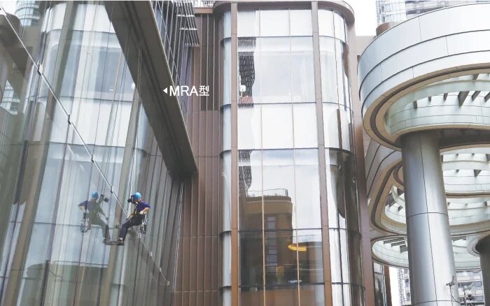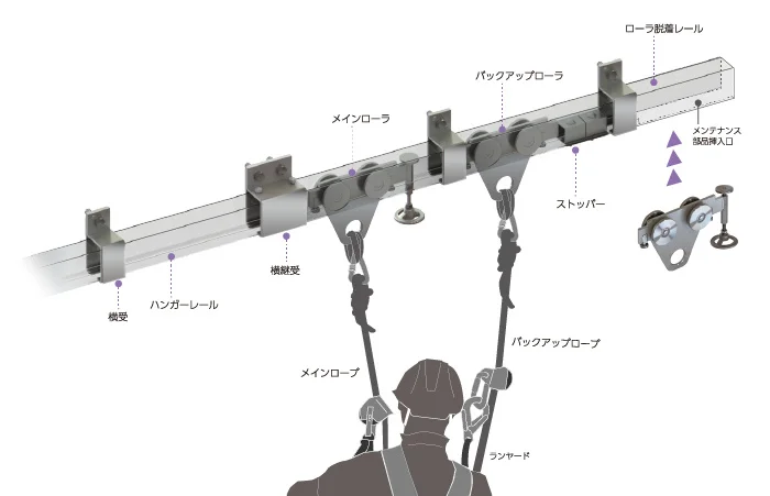 この「ハンガーレール」のノウハウを応用し、ビルメンテナンス向けに「墜落防止装置:セフティーレールシステム メンテナンスレール MRA型」を開発しました。