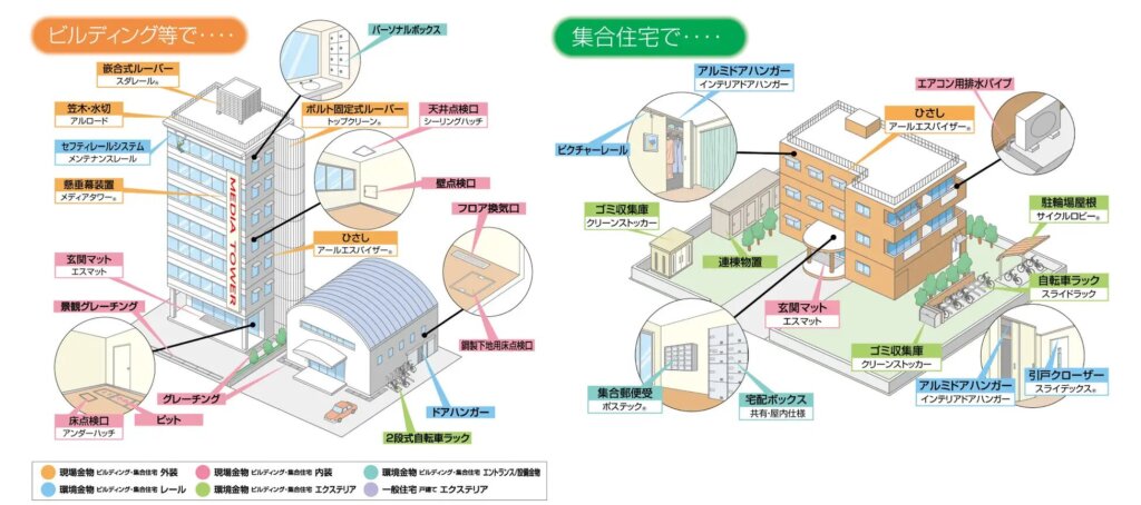 以来、建築金物・内外装建材・エクステリアなど数百種類以上の製品を製造する「建築金物総合メーカー」として日本の住環境を支えてきた。ハンガーレール、駐輪場屋根・自転車ラックの製造ではトップメーカーであり、日本で初めて家庭用物置を製造した歴史も持つ。
