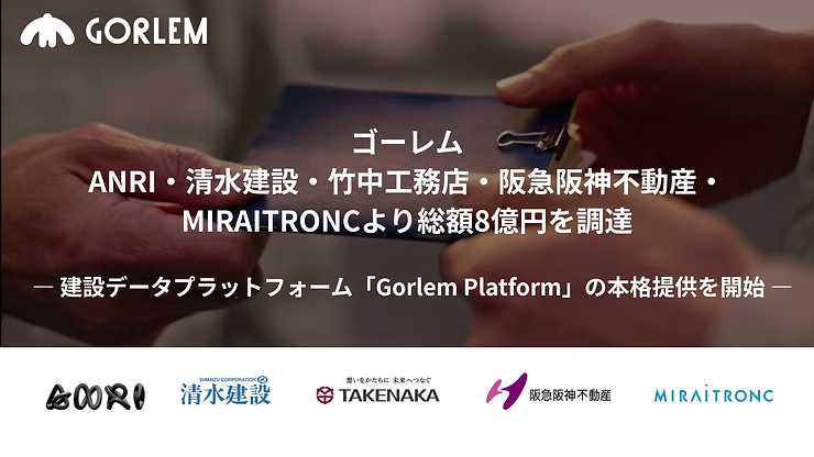 「建設生産を革新する」という構想を掲げ、建設データプラットフォームを運営する株式会社ゴーレム(本社:東京都千代田区、代表取締役:野村大輔、以下「ゴーレム」)が、ANRI、清水建設株式会社、株式会社竹中工務店、HHP共創ファンド1号投資事業有限責任組合(有限責任組合員:阪急阪神不動産株式会社)、MIRAITRONC投資事業有限責任組合(社名50十音順)の5社を引受先とした、