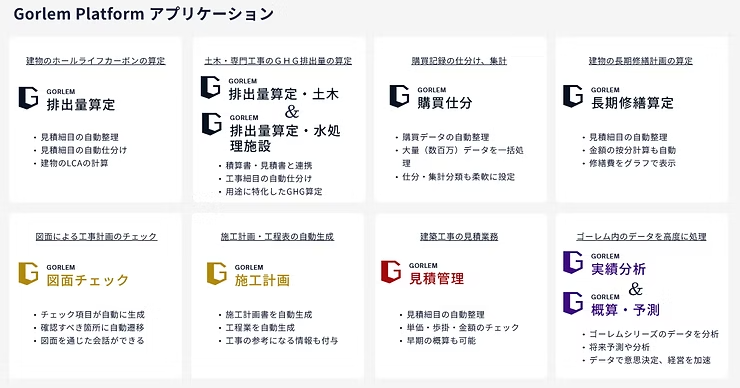 これまで提供してきたホールライフカーボンを算定する「排出量算定」「排出量算定・土木&排出量算定・水処理施設」や「購買仕分」「長期修繕算定」のアプリケーションに加え、新たに、「Gorlem Platform」内のデータを高度に分析処理する「実績分析&概算・予測」、図面による工事計画のチェックができる「図面チェック」、施工計画・工程表を自動で生成する「施工計画」、建築工事の見積もり業務を行う「見積管理」の4つのアプリケーションを追加し、「Gorlem Platform」として提供します。