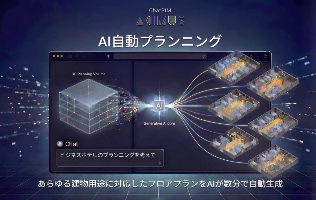 建築DXスタートアップの株式会社ACIMUS(本社:東京都千代田区、代表取締役 CEO:菊池 光貴、以下、ACIMUS)が、生成AIとの対話でBIMモデルを作成できるChatBIM「ACIMUS(アキムス)」において、建物ボリュームに対してAIが最適なフロアプラン(空間レイアウト)を自動提案する新機能「AI自動プランニング」を開発というリリースニュースをおとどけします。