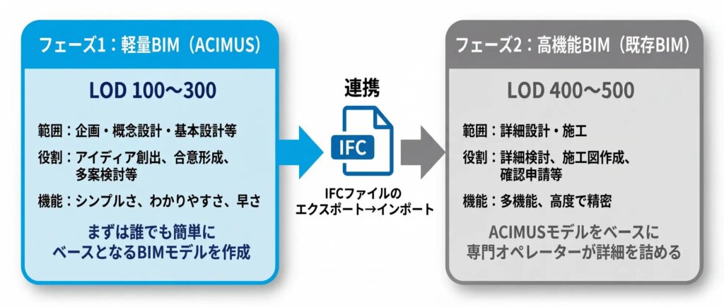軽量BIMと高機能BIMの棲み分け。軽量BIMは企画・概念設計・基本設計に特化し、IFCで高機能BIM(既存BIMソフト)との連携を可能にします。