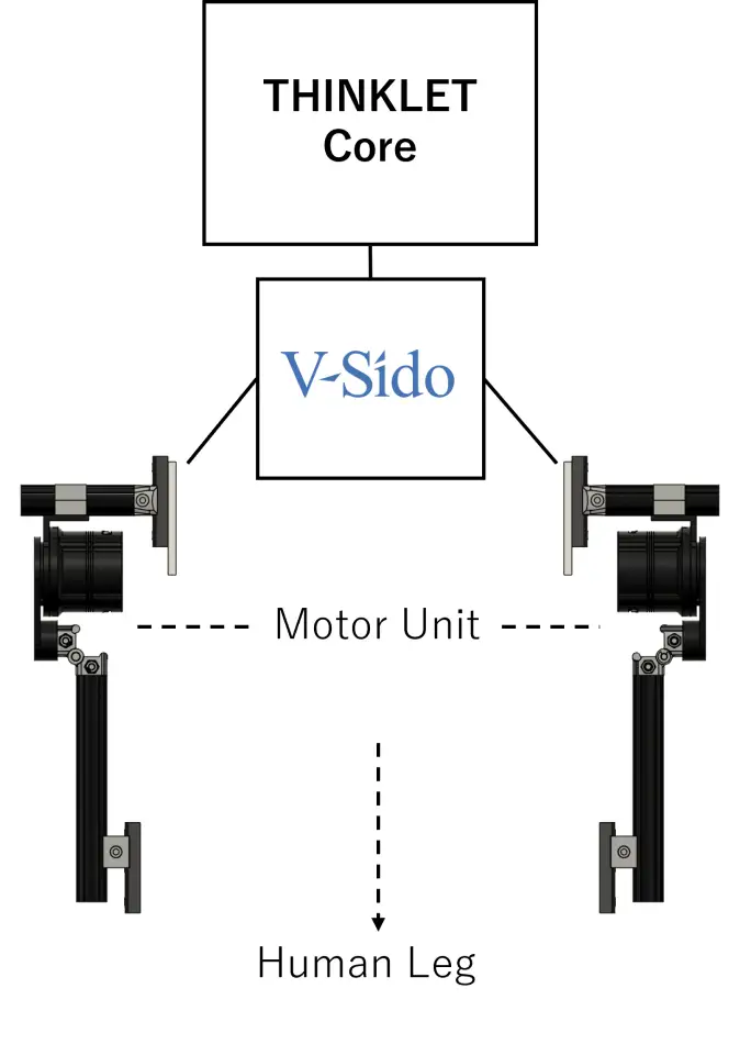 図:THINKLET Coreが状況を判断し、V-Sidoが最適な動作を生成、ホームセンター等で調達可能なモーターユニットを駆動させる仕組み。