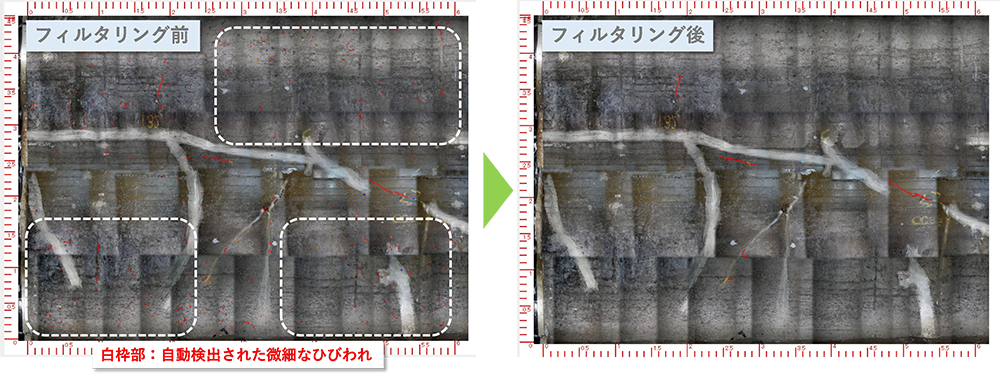 これにより、把握したいひびわれのみを即時に抽出することができ、高精度な点検データを有効的かつ効率的に活用することができます。