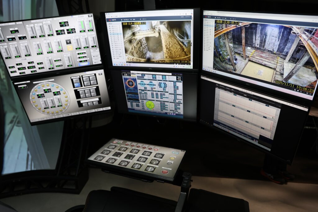 また、臨場感を高めたコックピット※3を導入し、現場の状況をより把握しやすくするとともに、実際の運転席と同様に配置したタッチパネル式操作スイッチと各種モニターを備えることで、シールドマシンの操作経験者であれば、特別な訓練を必要とせず操作できる仕様としました。