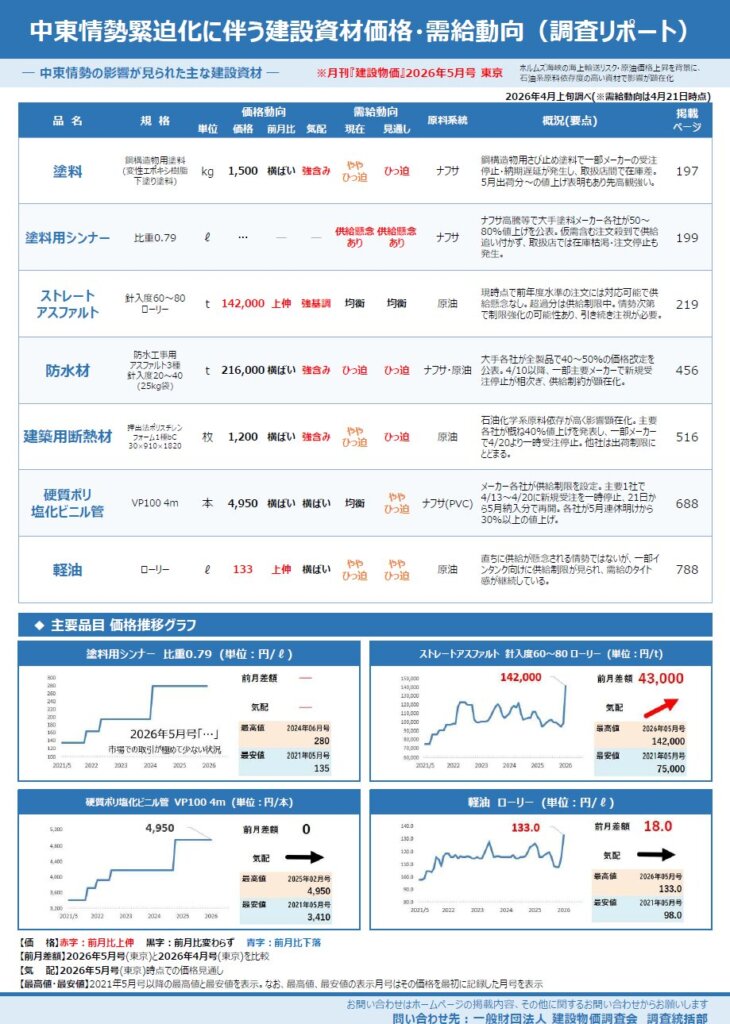 三菱UFJ銀行の経済調査によれば、世界の海上原油輸送の約2割が遮断されたことで、石油化学製品を原料とする建設資材の価格は、従来のインフレの枠組みを超えた異常な高騰を見せています。