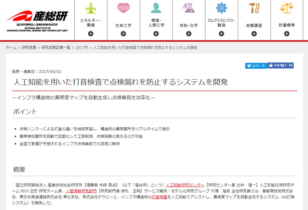 出典:産総研(人口知能を用いた打音検査で点検漏れを防止するシステムを開発)